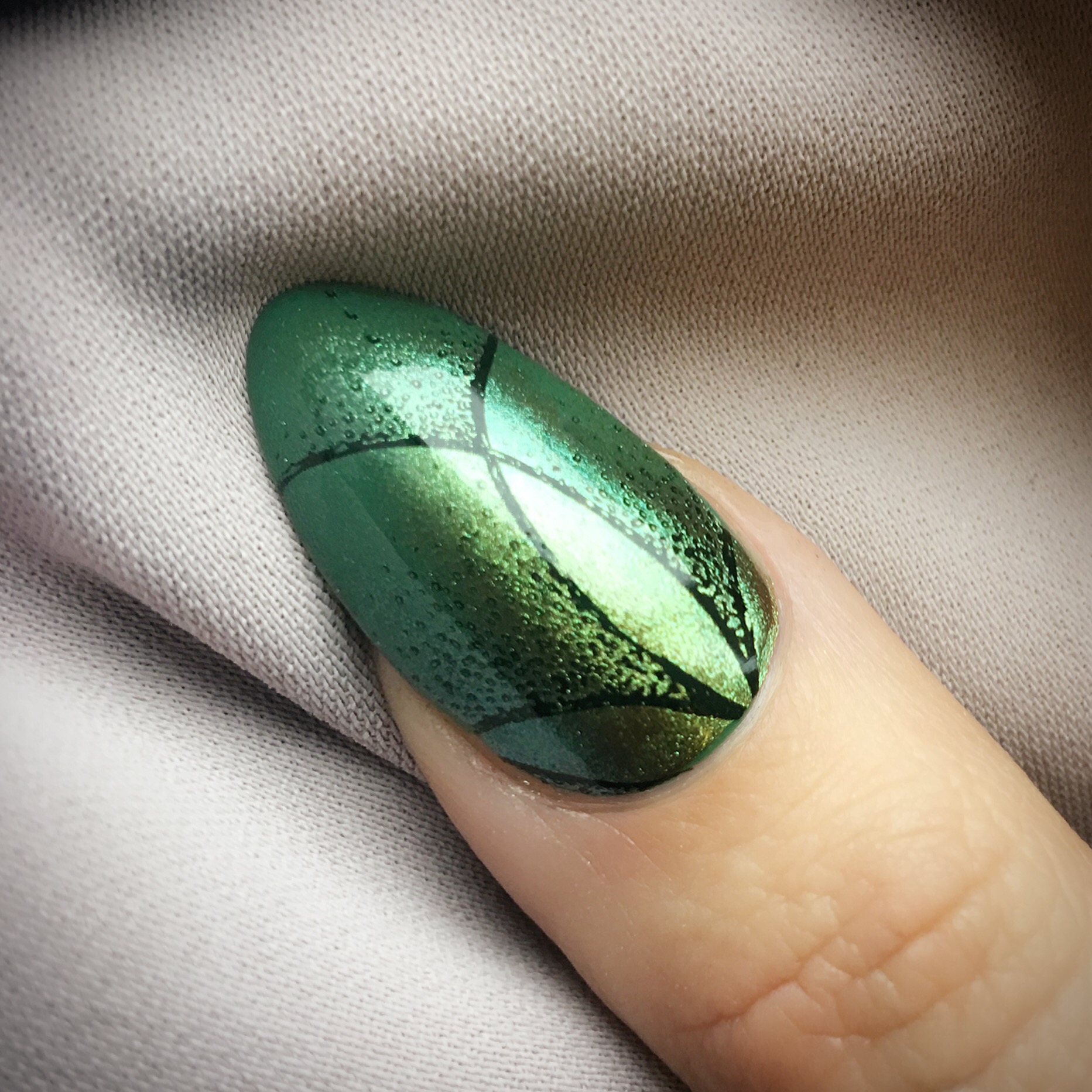 The nail above is a further example of Green Chameleon Chrome used directly on the top film of the cured Shellac colour layer. The fade gives a subtle warm to cool ombré which looks great teamed with this elegant stamping design. My client was keen to wear green on her nails today, so we went for the new Palm Deco, but this look would be amazing with other Shellac colours too. I’m excited to try it with Wisteria Haze, Cityscape, Rock Royalty and Tropix! Here was my method for this nail: