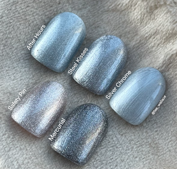 Last up is CND Shellac Steel Kisses, a wonderful metallic silver, has just a touch of bronze in it, to make the tone a little less cool and more neutral. I think this is exactly what we needed. Mercurial and Safety Pin are two of my favourite colours of all time, and Steel Kisses is a variation on the theme. I can’t wait to soften it with CND Shellac Matte Top Coat and cover it with geometric stamping designs. We will be doing this step by step in next week’s Tune in Tuesday show for sure!